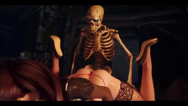 Asian chick fucks skeleton in dungeon