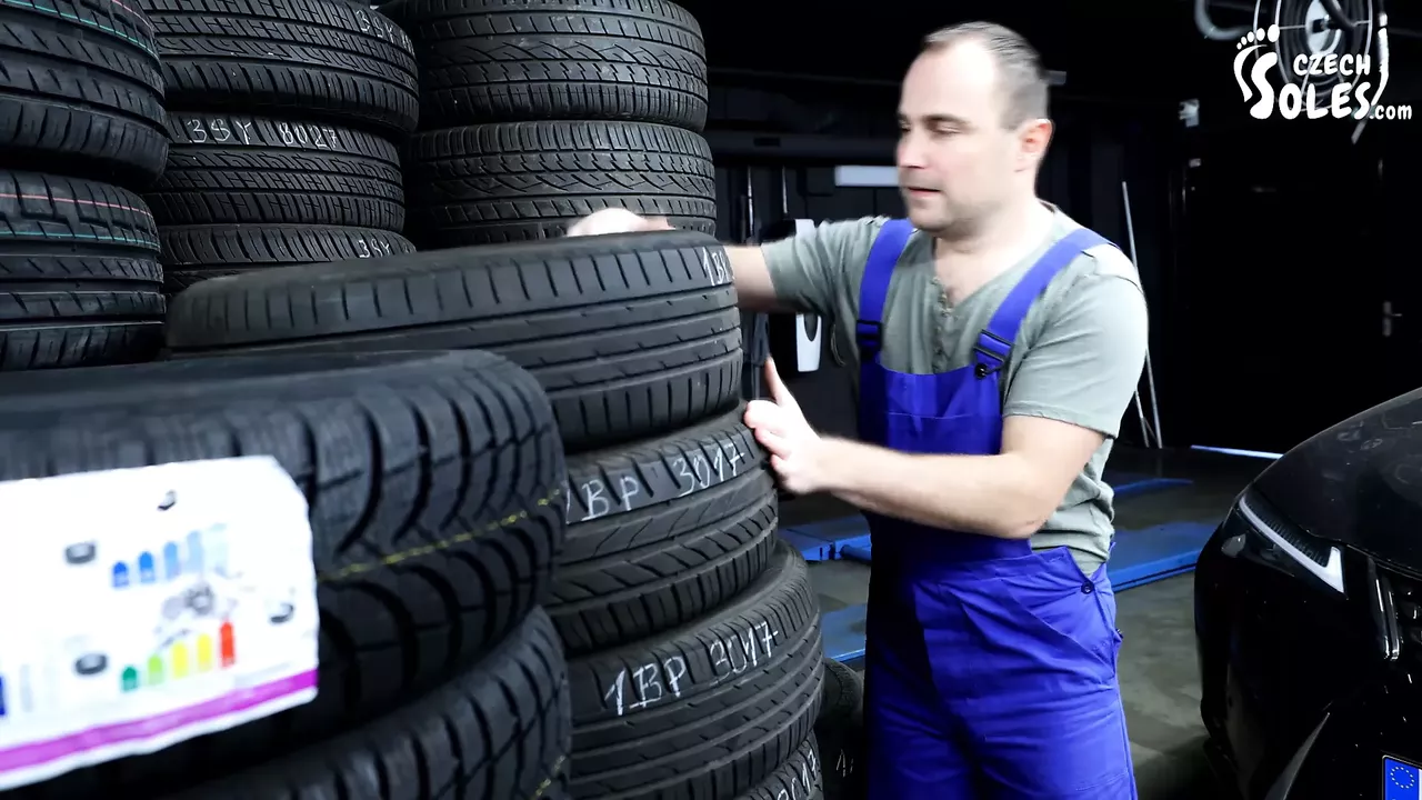Candid pneu-servis double foot worship with sexy customer