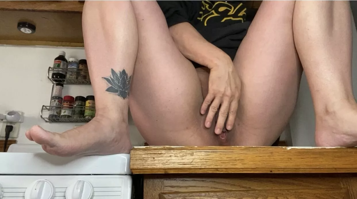 FTM fingers hairy pussy on kitchen counter.