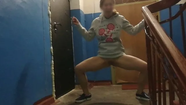 Girl with Shaved Pussy Walked Bottomless on the Public Stairs