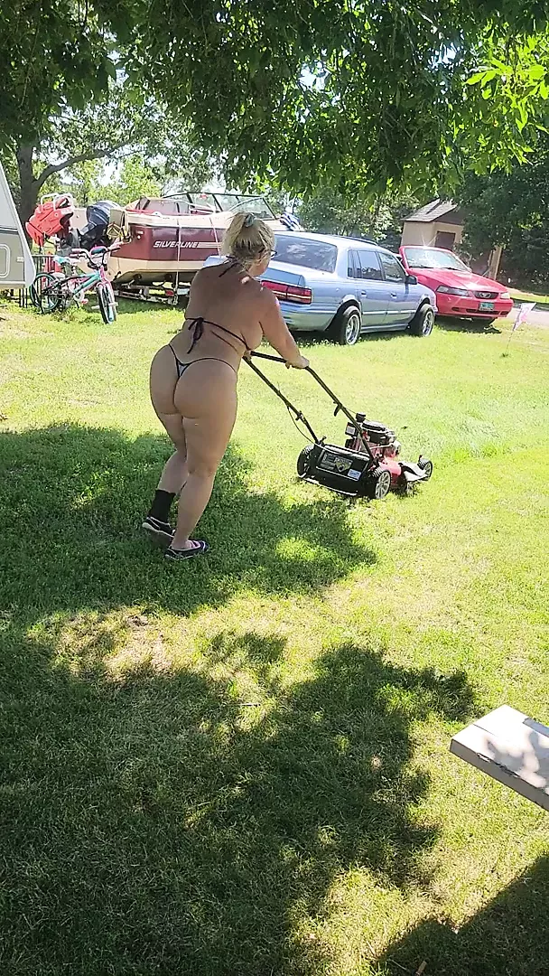 Got back to find wife mowing in a thong bikini, her ass and thighs jiggling with every step