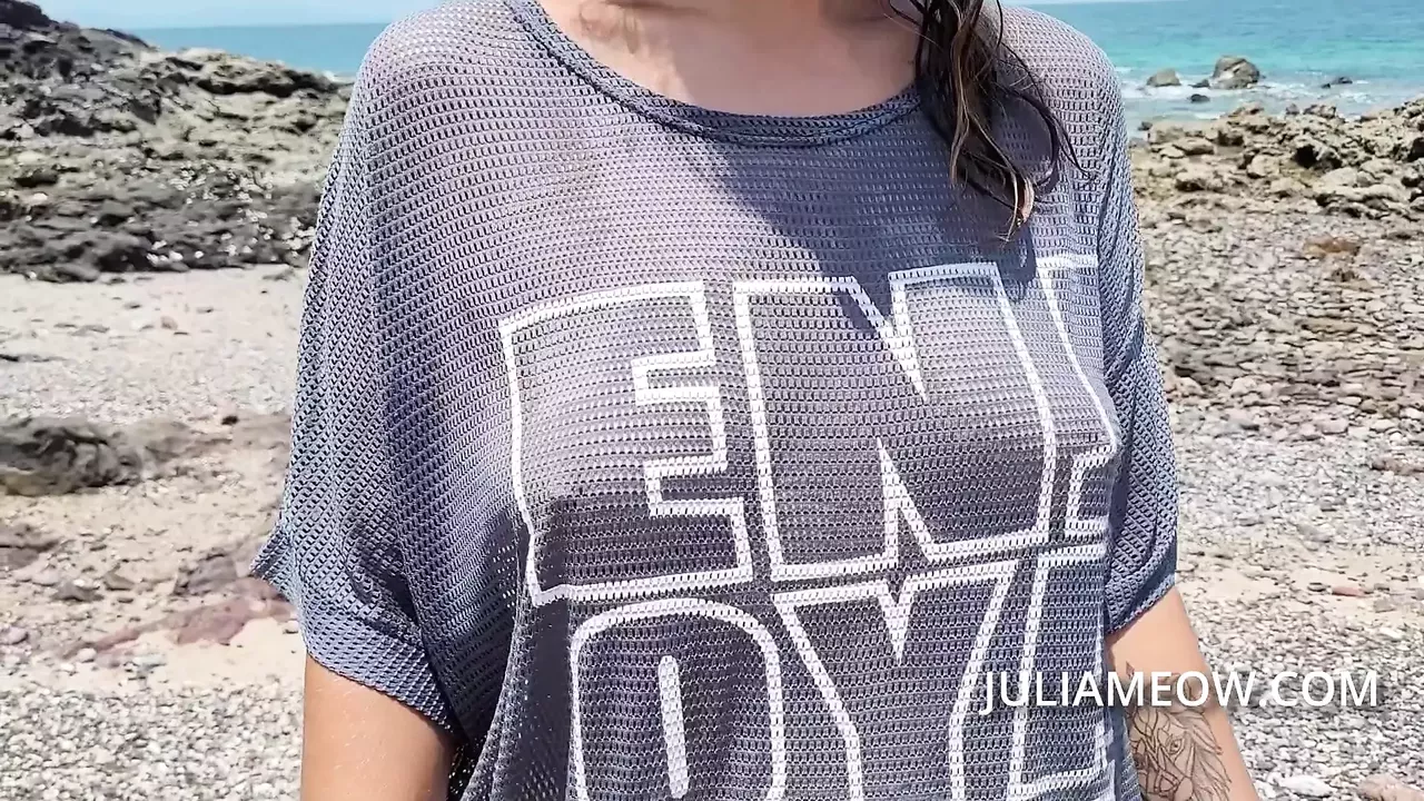 Hot mom in transparent t-shirt on the beach at low tide