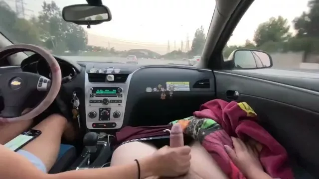 He Pulls out Her Little Tits as She gives Him a Handjob and pulls on His Balls